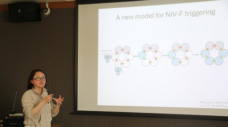 报告中,刘谦博士详细生动地介绍了其团队近年来的相关工作。基于单分子定位技术和结构荧光显微技术,团队自主搭建了全球先进的超分辨单分子定位显微镜(SMLM),分辨率可达10-20纳米,弥补了电子显微镜和荧光显微镜间的观察空白。有别于传统的分子生物学研究方法,刘谦博士团队以超分辨荧光显微成像技术为手段,结合经典的分子生物学、病毒学知识背景和数学计算模型,来研究RNA病毒(副黏病毒等)的结构和在宿主细胞中传播的分子机制,实现了物理、数学和生物的学科交叉应用。利用SMLM,团队揭示了尼帕病毒融合蛋白的六聚体激活模型、尼帕病毒膜融合蛋白的纳米结构对融合机制的影响、尼帕病毒出芽蛋白在细胞膜上的组装机制等重要问题,为理解病毒组装和传播方式及抗病毒药物靶点设计提供了新思路。与会师生围绕“超分辨显微镜在生化研究方面的适用性”、“尼帕病毒侵入、组装及逃逸过程的动态模型和膜融合机制”以及“病毒研究的分子方法”等方面积极探讨,畅谈交流。
