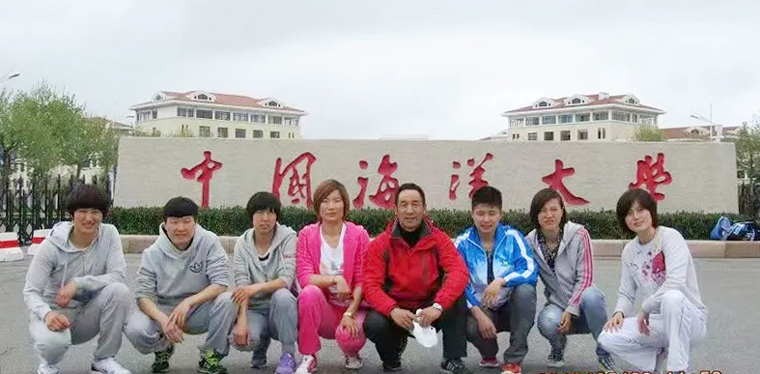 开云电竞网址拳击队队员(左一为李倩)与总教练在校门前合影(摄于2013年)