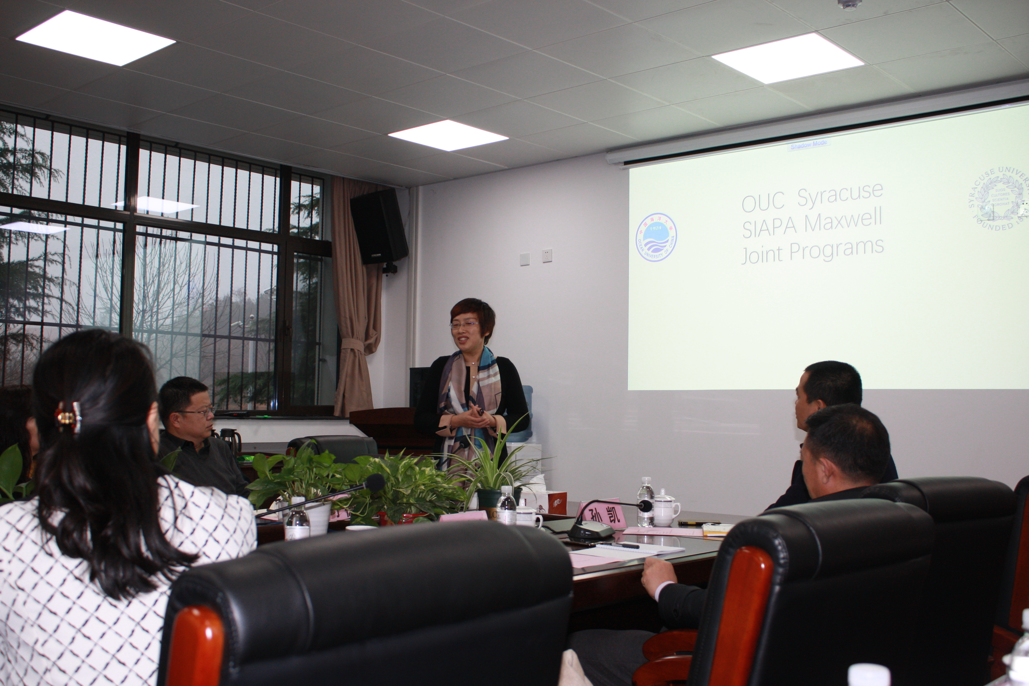 宋文红处长首先就两校合作的基础以及刘占江副校长来访的背景进行介绍。刘占江副校长回顾了与海大合作取得的重要成果,并介绍了雪城大学的优势学科、具体排名以及办学特色等。随后,院长王琪教授根据2018年10月与宋文红处长一同到访雪城大学麦克斯维尔公民与公众事务学院之后,学院对各项工作的推进情况进行了汇报。