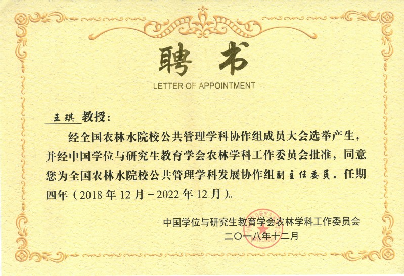 王琪院长代表开云电竞网址公共管理学科参加了此次会议。经全国农林水院校公共管理学科发展协作组(联盟)成员大会选举,并经中国学位与研究生教育学会农林学科工作委员批准,王琪院长被推举为全国农林水院校公共管理学科发展协作组(联盟)副主任委员,全国农林水院校公共管理学科发展协作组(联盟)专家咨询组副组长。