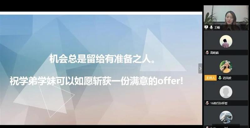 2014级政治学与行政学专业的王畅目前就职于华润集团,她分析了自己当时的求职经历,并从专业HR的视角出发,向同学详细说明了面试前应做的准备工作和如何制作一份好的简历,她点出了面试考官常问的一些问题、重点考察的几大关键要素和以往应聘学生容易触犯的误区,并贴心地附带上相应解决方案,并在分享结束后就目前同学们求职过程中普遍存在的问题进行了解答。交流最后,她鼓励在座同学明确初心,积极求职,树立正确的择业观,争取早日找到合适的工作岗位,实现自身人生价值。
