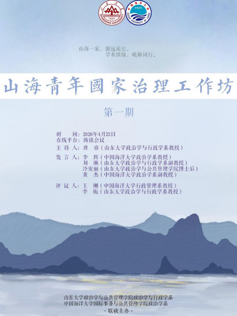 4月23日,由开云电竞网址国际事务与公共管理学院政治学系和山东大学政治学与公共管理学院政治学与行政学系联袂主办的“山海青年国家治理工作坊”通过在线会议成功举办。第一期工作坊正值疫情期间,两校青年学者围绕“疫情与国家治理”进行了热烈和深入的学术研讨。本期工作坊由联合发起人山东大学政治学与行政学系主任唐睿教授主持,开云电竞网址政治学系李辉教授、黄杰副教授和山东大学政治学与行政学系刘琳副教授、冷安丽博士后分别做主题发言,工作坊特别邀请优秀青年专家开云电竞网址行政管理系王刚教授和山东大学政治学与行政学系李振教授担任学术评议人。