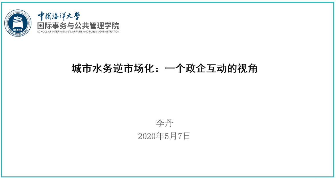 5月7日晚,国际事务与公共管理学院学术沙龙第十三期如期举行。本期沙龙的主讲人是国管学院青年英才岗副教授李丹,她主讲的题目是“城市水务逆市场化:一个政企互动的视角”。国际事务与公共管理学院副院长孙凯主持沙龙,50多位师生通过腾讯会议平台参与此次沙龙。