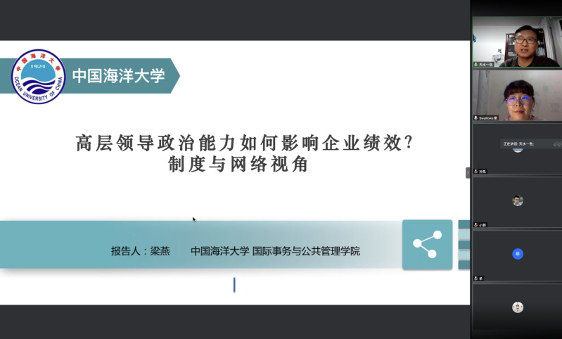 6月10日,国际事务与公共管理学院学术沙龙第十五期如期举行。本期沙龙主讲人是国管学院的梁燕老师,她主讲的题目是“高层领导政治能力对组织绩效的影响机理”。国际事务与公共管理学院行政管理系系主任王印红教授主持沙龙,共30多位师生通过腾讯会议参与此次沙龙。
