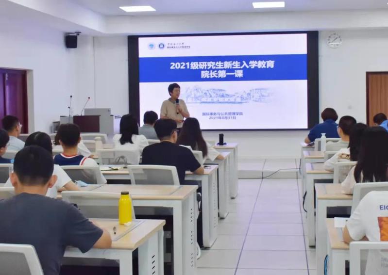 8月31日下午,国际事务与公共管理学院2021级研究生入学教育之“院长第一课”在智慧实验室举办。学院院长王琪,副院长孙凯,党委副书记、副院长黄立田,团委书记齐晓敏出席活动,2021级全体研究生参加活动。王琪院长以“筑梦国管,扬帆行远”为主题,为2021级全体研究生新生讲授了一堂精彩的入学第一课。