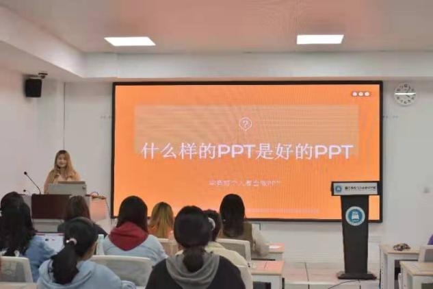 本次培训主讲人AM PPT设计公司创始人高敏以“你认为什么样的ppt是好的ppt”为问题导入,引发同学们对ppt制作标准的思考,从风格、排版、图表三个板块对如何做好PPT进行系统讲解。她强调了ppt视觉风格的重要性,通过举例向大家示范正确又高效的排版方式和排版的重要原则,详细讲解了ppt设计的四个原则“对比、对齐、亲密、重复”。鼓励在场同学们现场自主设计操作,并进行指导,解答同学们的疑惑。