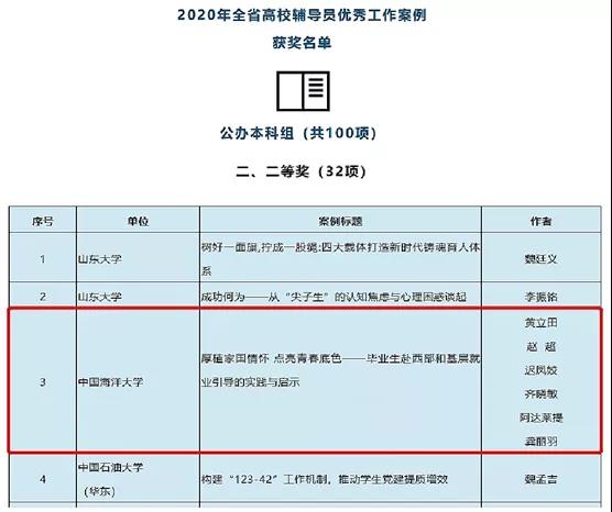 近日,山东省教育厅公布了“山东高校辅导员2020年度优秀工作案例”作品名单。我院由黄立田、赵超、迟凤姣、齐晓敏、阿达莱提、龚丽羽组队撰写的《厚植家国情怀点亮青春底色——毕业生赴西部和基层就业引导的实践与启示》工作案例荣获二等奖。