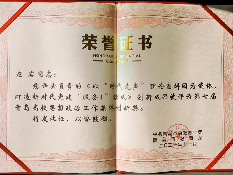 日前,青岛市委教育工委、青岛市教育局通报了第七届青岛高校思想政治工作创新奖评选结果,我校喜获集体创新奖1项,个人创新奖1项。由国际事务与公共管理学院党委书记庄岩牵头负责的创新成果《以“时代先声”理论宣讲团为载体,打造新时代党建“服务+”模式》荣获高校思想政治工作集体创新奖。