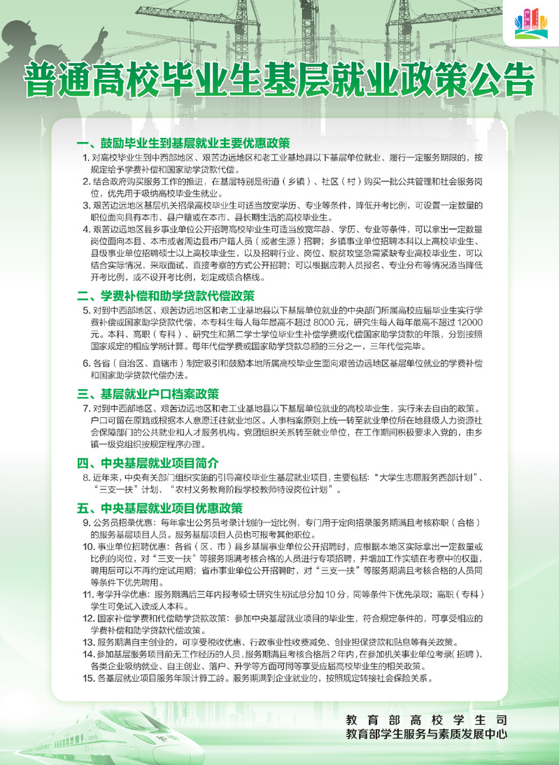 本期推送内容为《普通高校毕业生基层就业政策公告》。