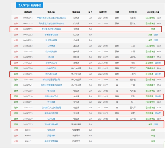 (2)进入研究生系统(2018级以后),点击“培养”—“我的课程”即可进行,本学期需要选择(专业学位研究生外国语、社会研究方法、地方政府治理、领导科学与艺术、宪法与行政法学、可持续发展专题)6门课程。
