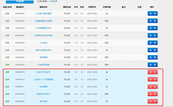找到“专业课”,选择《宪法与行政法学》、《公共部门人力资源管理》、《社会保障》、《领导科学与艺术》、《电子政务》这5门课。