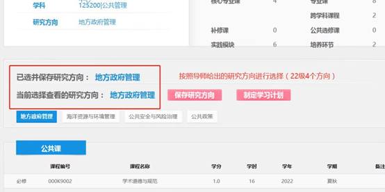 1、登录研究生系统(2018级)以后,点击“培养”-“选择方向”或直接点击主页面“制定计划”(2022级培养方案分地方政府治理、海洋资源与环境管理、公共安全与风险治理、公共政策4个方向,一般以导师的研究方向为准,请询问导师后选择一个保存)