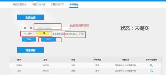 选择自己的导师-上传个人资料(自行准备)-提交-提交之后导师接收,显示“接收”状态。“接收”后即可进行培养方案制定。