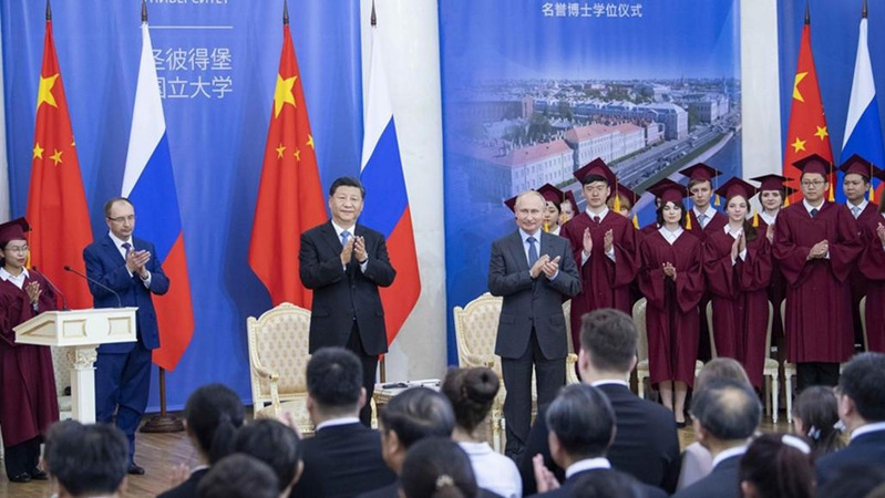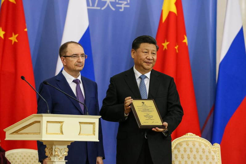俄罗斯当地时间2019年6月6日,在圣彼得堡国立大学举行了向中国国家主席习近平授予圣彼得堡国立大学名誉博士的庄严仪式,俄罗斯总统弗拉基米尔·普京和圣彼得堡国立大学校长尼古拉·可罗巴切夫出席了此次活动。在仪式现场,习近平主席表示,教育合作是增进人民了解和友谊的重要渠道,圣彼得堡国立大学同中国高校开展密切交流合作,有力推动了中华文化在俄罗斯的传播,有力促进了俄罗斯研究在中国的发展。