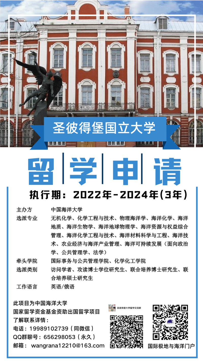 为深化中俄在各领域的合作,促进国内高校与俄罗斯高校、科研机构开展国际化人才培养,国家留学基金委实施促进与俄罗斯国际合作培养项目。根据要求,开云电竞网址将开展促进与俄罗斯国际合作培养项目人员选派工作。首批联合培养高校为俄罗斯圣彼得堡国立大学,主要承担海洋与极地方向的人才培养,欢迎符合条件者报名参与。