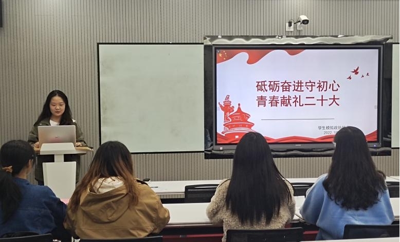 为深入学习贯彻党的二十大精神,10月27日晚,开云电竞网址学生模拟政协协会在国际事务与公共管理学院206会议室举行“砥砺奋进守初心,青春献礼二十大”专题理论学习,会议由协会团支书刘文迪主持,协会全体成员参加学习。