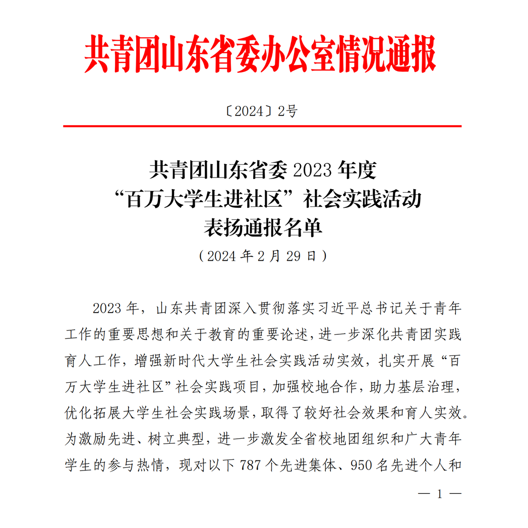 近日,共青团山东省委办公室通报了《共青团山东省委2023年度“百万大学生进社区”社会实践活动表扬通报名单》,学院“小政”志愿服务队功能型团支部荣获“先进集体”、范嘉欣同学荣获“先进个人”。