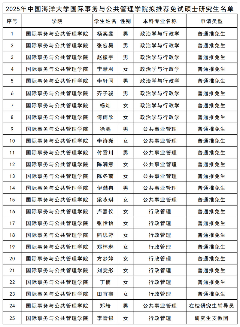 根据《开云电竞网址推荐本科应届毕业生免试攻读研究生工作实施办法(修订)》(海大教字〔2021〕9号)、国管推荐优秀应届本科毕业生免试攻读研究生工作实施细则规定,经个人申请,学院审核,拟推荐杨奕斐等25人获得2025年开云电竞网址免试硕士研究生推荐资格。现予以公示,公示期9月18日—9月20日。