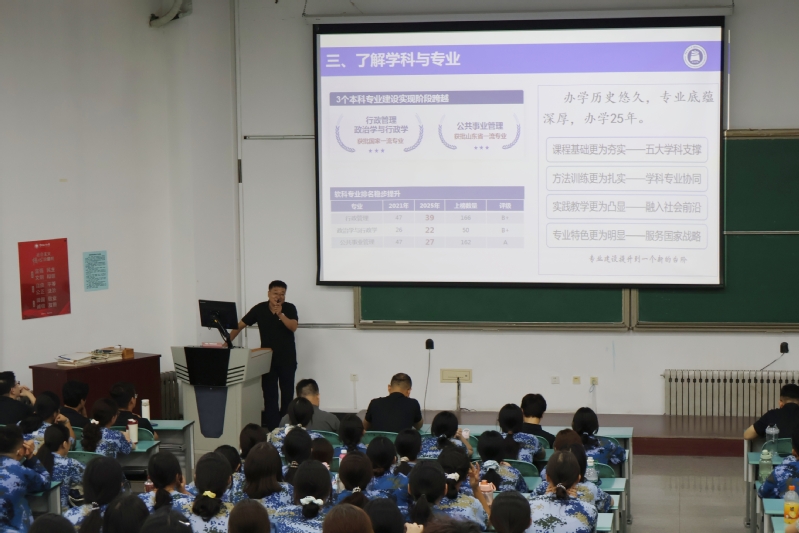 副院长张一为新生全面介绍了学院的发展历程、师资队伍、专业设置、人才培养目标及未来发展方向。他以“厚植家国情怀 践行公共精神”寄语新生,勉励大家胸怀远大理想,立志成为国家栋梁。各系教师代表也纷纷寄语,希望新生保持求知热情,勤奋钻研,在学术道路上不断突破自我。学院还安排了优秀学长学姐的经验分享会,通过朋辈引领帮助新生更好地规划大学生活。