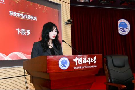 2021级国贸专业卞辰予同学代表获奖学生发言。她表示荣获优秀本科生奖学金不仅是对过去学习的肯定,更是对未来的指引。无论身处何方,都不会忘记母校的栽培与期望。