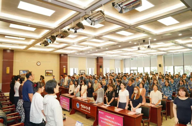 最后发言的是2025级新生代表雷响。“从今天起,我们有了一个共同的身份——海大国际教育人!”她呼吁全体新生勇于挑战自我、勤奋学习,将青春梦融入中国梦,在国际舞台上奋力书写新时代青年的精彩篇章。