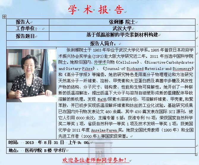 【学术讲座】张俐娜 院士:基于低温溶解的甲壳素新材料构建