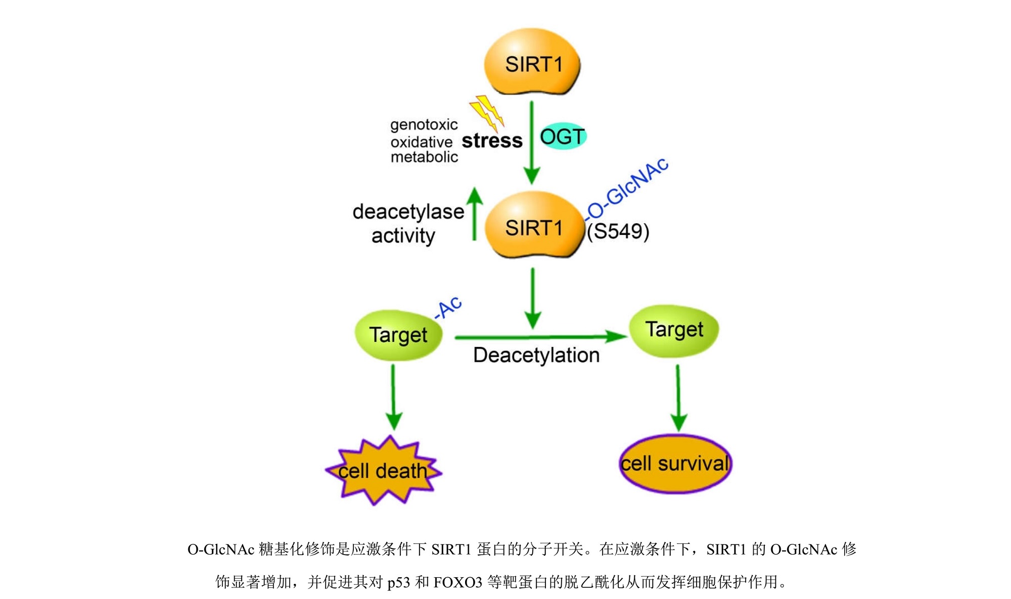 O-GlcNAc糖基化修饰是一种细胞内普遍存在、动态可逆的蛋白质翻译后修饰现象。O-GlcNAc可以通过影响蛋白稳定性、细胞定位和酶活性等调节蛋白质功能并在生理和病理过中发挥重要作用。该研究成果首次发现了SIRT1蛋白具有O-GlcNAc修饰,且修饰位点是549位的丝氨酸。SIRT1的O-GlcNAc修饰增加其与底物蛋白的亲和力并提高SIRT1的脱乙酰化酶活性。进一步研究表明,在应激(氧化应激、代谢应激和基因毒等)条件下,细胞内SIRT1的O-GlcNAc修饰显著增加,并促进其对p53、FOXO3等靶蛋白的脱乙酰化从而发挥细胞保护作用。众所周知,卡路里限制能降低衰老相关疾病的发生和延年益寿。本研究成果表明,卡路里限制能可能通过O-GlcNAc修饰激活SIRT1而起到细胞保护作用,从而揭示了节食延年益寿的一个新的分子机制。综上所述,该研究发现了SIRT1活性调控的新机制,首次证明了O-GlcNAc修饰是SIRT1抵抗应激的分子开关,表明O-GlcNAc修饰可能成为抗衰老和老年性疾病的新靶点,为抗老年性疾病药物和长寿药物的研究开辟了新途径,具有重要的理论意义和明确的应用前景。