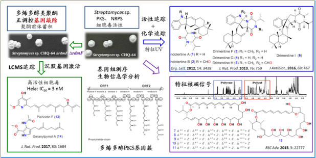 1. 融合基因-化学-活性指标进行多维度筛选, 指导“潜力菌株” Streptomyces sp. CHQ-64新结构活性化合物的充分发现(J. Nat. Prod. 2017, 80: 1684)