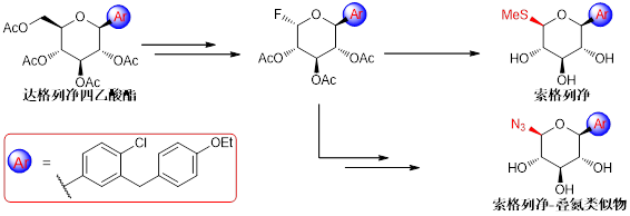 上述糖氧化自由基脱羟甲基氟代反应具有以下特点和优势:1)反应条件温和、官能团耐受性强且底物适用性好:通过对28个糖类化合物的脱羟基氟代反应的研究发现,糖化学中常用的保护基和取代基如乙酰基、苯甲酰基、叠氮、氟苷在反应条件下不受影响,且从单糖、二糖(海藻糖)到寡糖(β-环糊精)等复杂寡糖都适用于该反应;2)适用于结构多样的糖类分子的发散性合成: 以三氟化硼乙醚作为催化剂,所得氟代糖能通过C-F键的活化与碳、氮、氧、硫、膦等多种亲核试剂反应,得到结构独特的稀有高碳糖或杂原子取代糖;3)能够用于新型药物分子实体合成及先导物的发现:法国制药巨头赛诺菲公司开发的索格列净是一种钠-葡萄糖协同转运蛋白-1/2(SGLT1/2)双重抑制剂。以达格列净乙酸酯为原料,借助自由基脱羟甲基氟代反应,李明教授团队开发了一条索格列净的全新合成路线,并通过对其进行结构改造和活性测试发现5-叠氮修饰的索格列净类似物是研发新型SGLT2抑制剂的良好先导化合物 (图 2)。