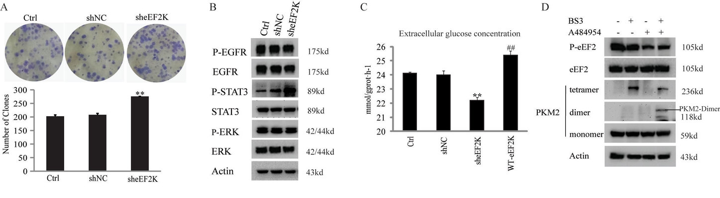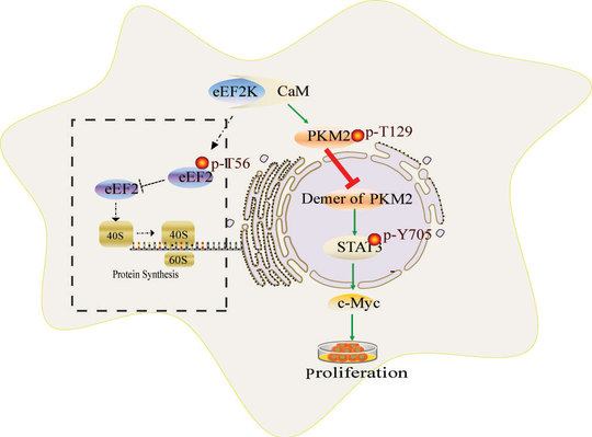 李静课题组与南澳大利亚健康与医学研究所Christopher G. Proud课题组合作,发现eEF2K表达能够抑制非小细胞肺癌细胞A549与H1299的细胞增殖。通过对大量信号分子筛查发现eEF2K能够显著抑制STAT3蛋白磷酸化水平。进一步采用32P示踪、定点突变和蛋白质谱检测等手段,发现eEF2K可以磷酸化PKM2蛋白T129位点而抑制PKM2二聚化,进而减少PKM2二聚化对STAT3蛋白磷酸化,从而抑制c-Myc诱导的肿瘤细胞有氧糖酵解与细胞增殖作用。该信号通路途径为首次发现。该项研究揭示了eEF2K作为一种真核延伸因子作用以外的新功能,为针对性开发促进eEF2K增加的抗肺癌新药奠定了理论基础。研究成果发表于Cell communication and signaling.2020, 18:25.(https://doi.org/10.1186/s12964-020-0528-y,IF:5.111)。李静教授为独立通讯作者,第一作者为硕士研究生肖敏,南澳大利亚健康与医学研究所博士Jianling Xie,戚欣老师、Proud教授和毕业生王根柱等为合作作者。