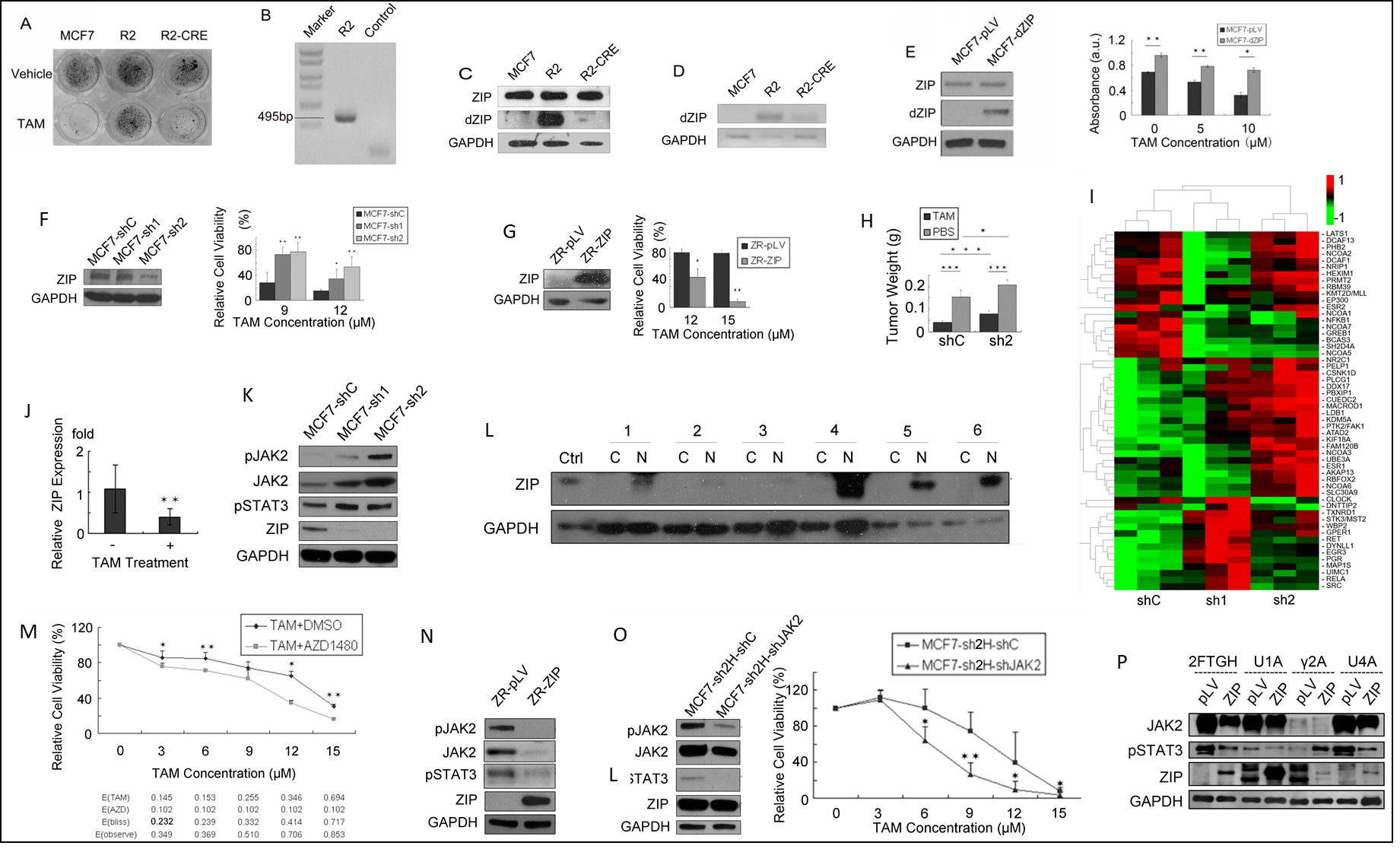 A-E.利用VBIM系统筛选发现乳腺癌细胞他莫昔芬耐药相关的Zip基因;F-L. 高表达全长Zip基因,可以解除乳腺癌细胞的他莫昔芬耐药,而高表达Zip截断体dZip,可以增强乳腺癌细胞的他莫昔芬耐药;M-P. Zip介导的乳腺癌细胞他莫昔芬耐药的功能与其调控STAT3磷酸化的水平有关。