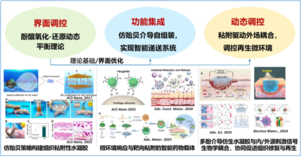 组织修复材料的生物功能性和界面结合性问题是影响其临床应用的关键瓶颈,涉及材料、化学、医学等多学科交叉,而传统的组织修复材料普遍存在湿态组织粘附/整合性弱、生物功能性不足两大难题。团队基于海洋生物材料特色,聚焦仿生功能化生物材料与组织修复再生这一核心科学问题,仿生海洋贻贝的多尺度粘附机制,形成了“界面-功能-调控”的新型仿生生物材料体系。包括借鉴贻贝在水环境中稳定粘附的分子机制,开发新型仿贻贝组织粘附水凝胶,突破湿组织表面粘附的关键技术难题;提出酚醌氧化还原介导的自组装机制,构建具有分子识别和细胞粘附功能的智能递送载体提高靶向细胞药物递送效率;进一步利用粘附介导外场刺激驱动微环境重塑策略,设计具有仿生智能水凝胶,并耦合光/电场等物理刺激调控细胞行为,为复杂组织再生提供解决方案。