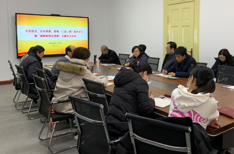 2021年1月14日下午,医药学院第一、第二党支部在鱼山校区地质馆221会议室开展“坚定信念,反对邪教,贯彻三是三要”集中学习暨“旗帜鲜明反邪教”主题党日活动,会议由教工第一党支部书记韩峰同志主持。