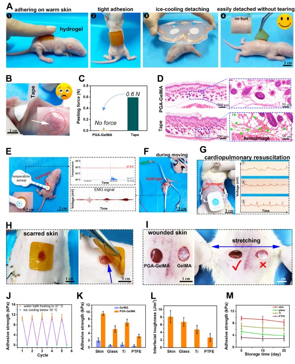 图3. 通过体温触发实现粘附和降温实现无损剥离的PGA-GelMA水凝胶