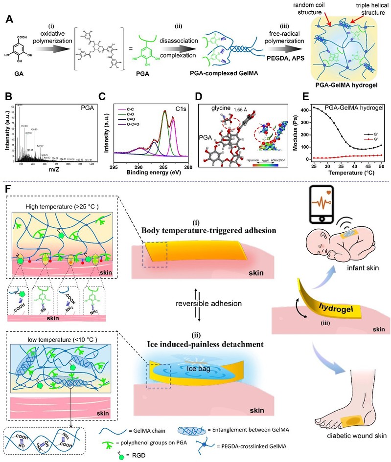 针对以上问题,开云电竞网址韩璐教授与西南交通大学鲁雄教授合作,提出了一种基于多酚-蛋白质络合策略制备具有体温触发快速粘附及无损伤按需剥离的水凝胶的策略。首先,通过碱性氧化预聚方式,形成了富含酚基和醌基的多酚预聚物(PGA);其次,在双键化明胶(GelMA)成胶过程中利用多酚基团的多重相互作用,打破GelMA分子链间的氢键作用,调节GelMA链的缠结密度,使得GelMA网络具有体温响应性,实现在体温条件下保持稳定性的同时分子链流动性增强的特性。当该水凝胶与人体皮肤接触后,体温触发其发生相转变实现高效快速粘附且能长时间保持粘附稳定。对水凝胶表面简单的降温后,网络中的GelMA分子链间重新生成氢键,水凝胶粘附力降低,实现无损伤剥离。另外,PGA的引入调整了GelMA网络的交联方式,在GelMA网络内引入了可牺牲的非共价键交联,从而赋予PGA-GelMA水凝胶与皮肤组织匹配的机械柔韧性和高延展性,避免了水凝胶在皮肤表面剥离时被拉扯造成的伤害。此外,该PGA-GelMA水凝胶还表现出优异的抗炎、抗氧化、抗过敏等生物活性,能够有效避免传统皮肤粘合剂在长期与皮肤接触中导致的皮肤刺激或过敏现象。