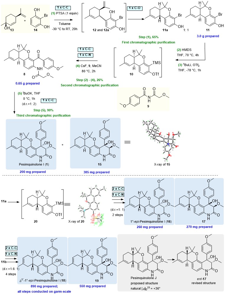 Pesimquinolone I的全合成路线图2所示。从合成关键中间体11开始,由商业可得的(1S,4R)-1-甲基-4-(1-甲基乙烯基)-2-环己烯-1-醇(13)和2-溴间苯二酚(14)为起始原料,通过条件优化筛选,最终以PTSA为酸,甲苯为溶剂,-30℃到室温的条件下,实现了顺式关键中间体11的大量制备(第一次柱层析分离)。在大量制备中间体11后,经过逆Brook重排反应顺利得到中间体10。接下来的挑战是芳炔插入反应来区域选择性一步实现两个化学键和喹啉酮母核的构建。在CsF存在下,中间体10与二酰亚胺9进行区域选择性的芳炔插入反应,以三步26%的收率成功构筑了二苯甲酮8(第二次柱层析分离)。随后使用分子内Aldol反应,在叔丁醇钾的碱性条件下,以非对映选择性、90%的收率合成了天然产物pesimquinolone I(1)及其非对映异构体15(第三次柱层析分离)。最终,以5步化学反应、3次柱层析分离、2.8%的总收率高效完成了天然产物pesimquinolones I的首次全合成。