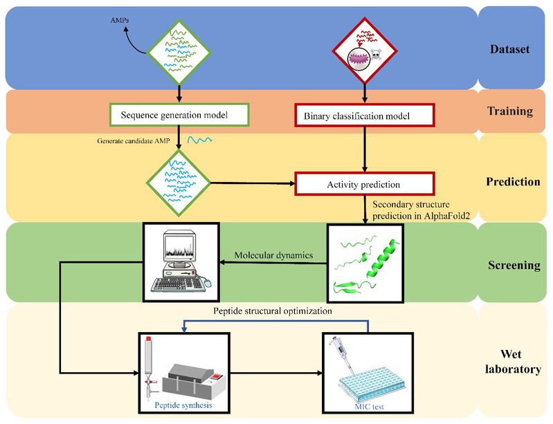 传统多肽药物设计往往依赖于个人的专业经验,整个过程耗时耗力。随着计算机技术的进步,人工智能和机器学习在药物发现中发挥着关键作用。目前,深度学习已应用于抗菌肽的从头设计,并能够高效地解决抗菌肽的分类问题。