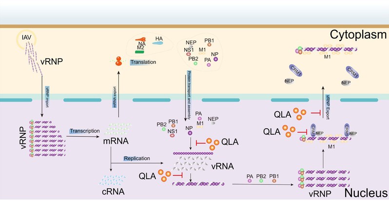 王伟教授课题组继续针对QLA抗IAV机制进行了系统研究。首先,微基因组和FISH实验表明QLA不仅抑制病毒vRNA复制和mRNA转录,还能抑制NP蛋白的细胞质定位和蛋白表达,表明QLA主要靶向病毒NP蛋白 (图1)。进一步研究发现QLA抑制病毒vRNA和vRNP出核而非mRNA出核,且抑制NP的NES3通过CRM1途径的出核;而SPR和Co-IP实验发现QLA能特异结合NP且干扰NP与CRM1的结合,表明QLA靶向抑制vRNP核质转运 (图1)。另外,QLA还能通过抑制NP与RNA结合而非NP寡聚化来干扰vRNP组装。最后,分子对接结合耐药株筛选和反向遗传学研究发现QLA主要作用于NP的Arg/Lys305、Cys488和Gly490,且这些氨基酸周围的结合口袋可作为NP靶向的抗IAV药物的潜在靶点。总之,QLA主要通过靶向NP来抑制RNP的组装和出核转运,从而抑制IAV的体内外感染 (图2)。本研究成果不仅为海洋真菌来源的抗IAV药物研发提供物质基础和理论参考,还可为靶向NP的新型抗IAV药物的理性设计提供借鉴,具有重要的理论意义和应用前景。