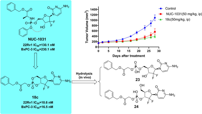 核苷类药物是抗肿瘤和抗病毒领域非常重要的一类药物,在临床中被广泛应用。吉西他滨是二氟核苷类细胞周期特异性的抗代谢类抗肿瘤药物,在临床上用于胰腺癌、前列腺癌、非小细胞肺癌、卵巢癌等的治疗。在吉西他滨的长期临床应用中发现了许多不足之处如血浆半衰期短、无法口服给药、副作用大及严重耐药现象等。因此,针对吉西他滨的不足,研究人员设计开发了大量的吉西他滨前药,NUC-1031是使用Protide技术开发的吉西他滨前药,目前进入临床 II/III期,然而NUC-1031在转移性胰腺癌的III期临床因未表现出优于吉西他滨的疗效而终止,因此继续开发活性更好的吉西他滨前药具有重要临床价值。