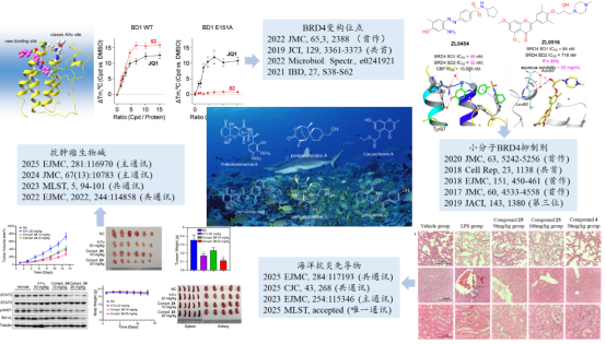 近年来主要从事基于海洋天然产物的抗炎、抗肿瘤先导物发现工作,取得了多项成果,主要包括: 首次发现并刻画了溴结构域蛋白4(BRD4)全新变构调节位点,刻画了该变构调节位点的关键氨基酸残基,利用氨基酸单点突变验证了其干扰组蛋白赖氨酸对BRD4经典口袋的结合功能,为下一步寻找BRD4新的作用靶点和信号通路奠定了基础。 利用骨架跃迁及理性结构改造,设计合成得到新型苯酚类及色原酮类BRD4抑制剂,化合物ZL0454和ZL0516等分别实现对BRD4 及BRD4 BD1的选择性。通过分子生物学手段揭示了其通过阻断RelA-BRD4信号通路、干扰促炎性因子IL-6和CIG5等基因表达的抗气道炎症作用机制。 基于喹唑啉酮类海洋生物碱penipanoid C,通过设计结构多样性的连接链,靶向获得对BRD4 BD2具有选择性的纳摩尔级小分子抑制剂,对LPS诱导的巨噬细胞中TNF-α和IL-6的生成具有显著抑制作用;小鼠急性炎症模型中,50 mg/kg剂量下对全身炎症的缓解作用与临床III期药物RVX-208相当,为高效低毒海洋抗炎分子提供了备选。
