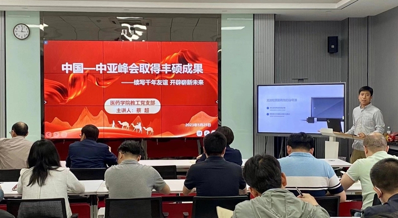 5月25日下午,医药学院教工第一、二党支部在药物楼B楼学术报告厅室开展了学习贯彻习近平新时代中国特色社会主义思想主题教育,本次活动主题围绕学习中国-中亚峰会取得的丰硕成果展开,会议由医药学院教工第二党支部书记蔡超主持。