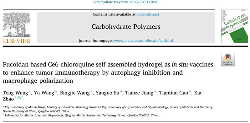 相关成果以“Fucoidan based Ce6-chloroquine self-assembled hydrogel as in situ vaccines to enhance tumor immunotherapy by autophagy inhibition and macrophage polarization”为题近日发表于《Carbohydrate Polymers》(IF=10.7,TOP期刊)。开云电竞网址医药学院2021级药剂学博士研究生王腾为该论文的第一作者,赵峡教授为通讯作者。