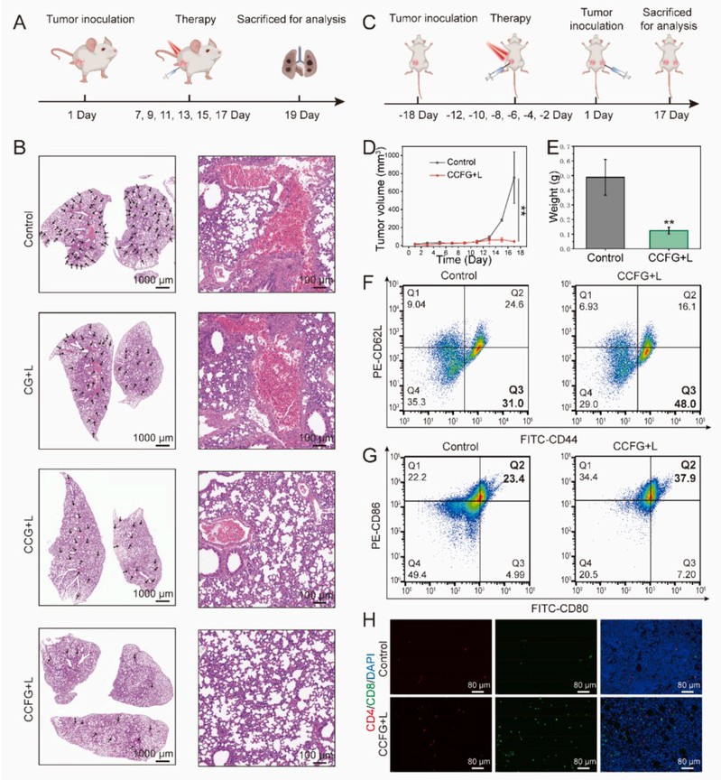 另外,还通过建立肿瘤转移模型(图3A)和复发模型(图3C),评价了原位疫苗CCFG的抗肿瘤转移和复发效果。结果表明,CCFG可显著抑制肿瘤的肺转移和肿瘤复发。CCFG+L诱导的树突状细胞成熟(CD86+/CD80+)和效应记忆T细胞(CD62L-/CD44+)的比例明显高于对照组,表明CCFG+L建立了强大的免疫记忆,可有效抑制肿瘤的转移和复发。