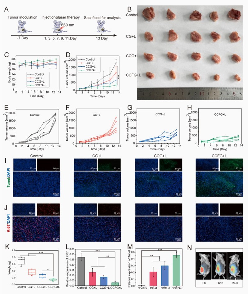 图 2:对 4T1 乳腺肿瘤的体内抗肿瘤活性。(A) 不同制剂的治疗流程图;(B) 不同治疗后的肿瘤图像;(C) 用不同制剂治疗小鼠 13 天内的体重变化;(D) 不同制剂治疗后小鼠肿瘤体积的变化;(E-H) 不同组别的肿瘤生长曲线;(I) 治疗后第 13 天肿瘤切片的 Tunel 染色图像,凋亡细胞用绿色标记;(J) 治疗后第 13 天肿瘤切片的 Ki67 表达(红色荧光);(K) 第 13 天的最终平均肿瘤重量;(L) Ki67的相对表达;(M) Tunel的相对表达;(N) 不同时间小鼠的 CCFG 生物分布图像