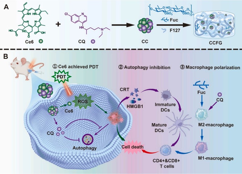图 1:CCFG 作为原位疫苗的示意图:(A) CCFG 的制备;(B) CCFG 作为原位疫苗通过 3 个步骤抑制肿瘤:(1) Ce6 通过产生 ROS 实现 PDT,(2) CQ 通过抑制自噬增强 ICD 效果,(3) Fuc 通过 M1 巨噬细胞极化增强 APC 的抗原递呈