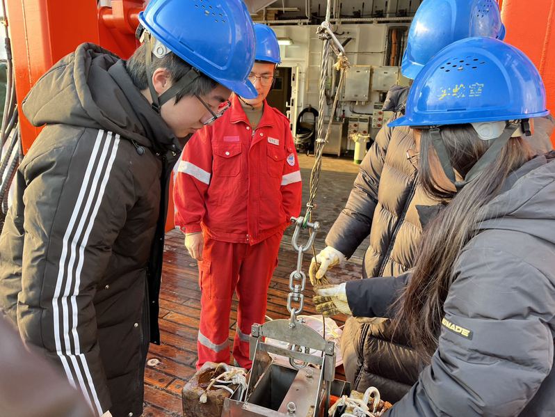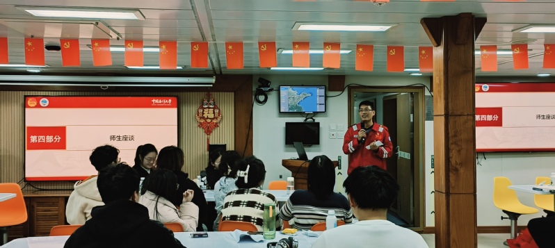 值得一提的是,12月2日晚,一场别开生面的主题团日活动在船上举行。全体老师和同学们一起,进行了一场深入的座谈交流。科考船员们作为特邀嘉宾,耐心地解答同学们在实习过程中遇到的各种疑问,分享他们在海上科考生涯中最惊险、最难忘的经历。一位资深船员讲述了在一次台风来袭时,全体船员齐心协力、坚守岗位,成功应对危机的故事,让同学们深刻感受到了科考工作的艰辛与不易,以及科考人员坚韧不拔的精神品质,现场气氛热烈而融洽。