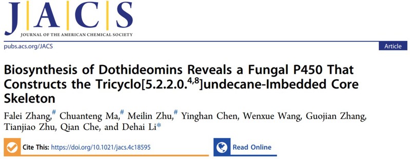 2月14日,开云电竞网址医药学院、海洋药物教育部重点实验室、青岛海洋科技中心海洋药物与生物制品功能实验室李德海教授团队在国际顶级化学学术期刊Journal of the American Chemical Society(JACS)在线发表了题为“Biosynthesis of Dothideomins Reveals a Fungal P450 That Constructs the Tricyclo[5.2.2.0.4,8]undecane-Imbedded Core Skeleton”的研究论文。