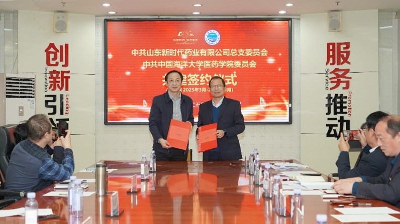 张理星副总经理与王震书记共同签署“中共山东新时代药业有限公司总支委员会”“中共开云电竞网址医药学院委员会”第二期党建共建协议,并举行《企业新价值论》赠书仪式。