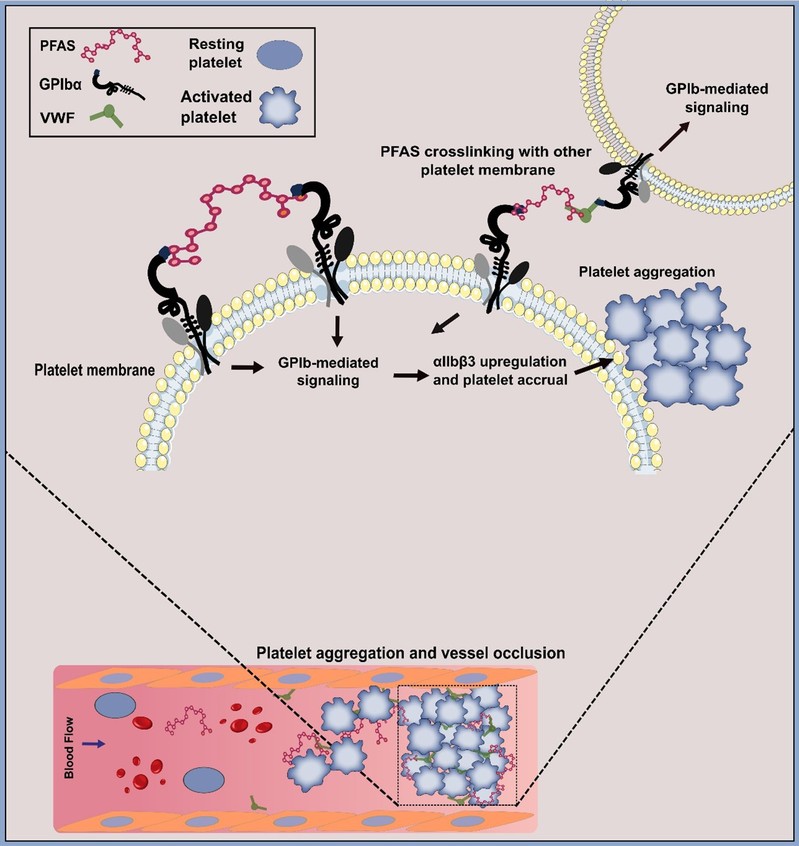 图1. PFAS靶向血小板膜受体GPIbα诱导血小板聚集和血栓形成示意图