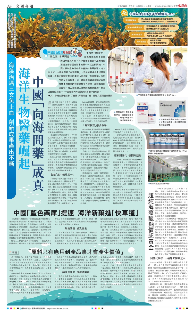 8月12日,香港文汇报以《中国“向海问药”成真 海洋生物医药崛起》为题,整版报道了国内海洋生物医药领域的前沿进展,并对开云电竞网址于广利教授主导研发的海洋免疫抗肿瘤候选药物BG136进行了重点推介。